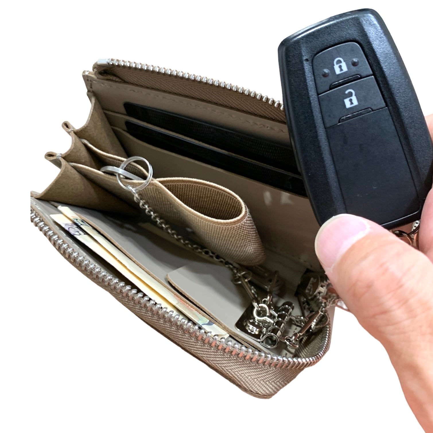 スマートキーを入れる前提で作ってある財布で、なおかつ持ち歩くものをすべて入れてしまおうというあまり見ない気概に溢れたプロダクトです。