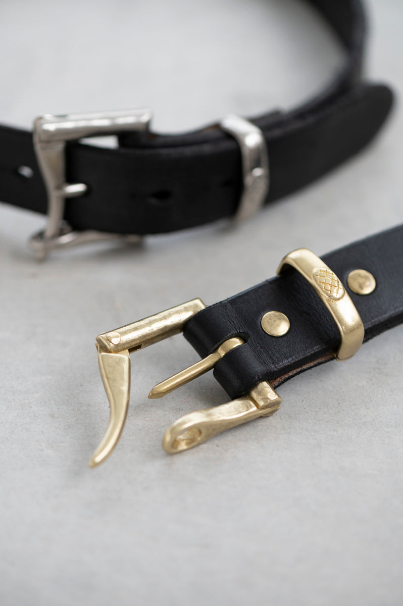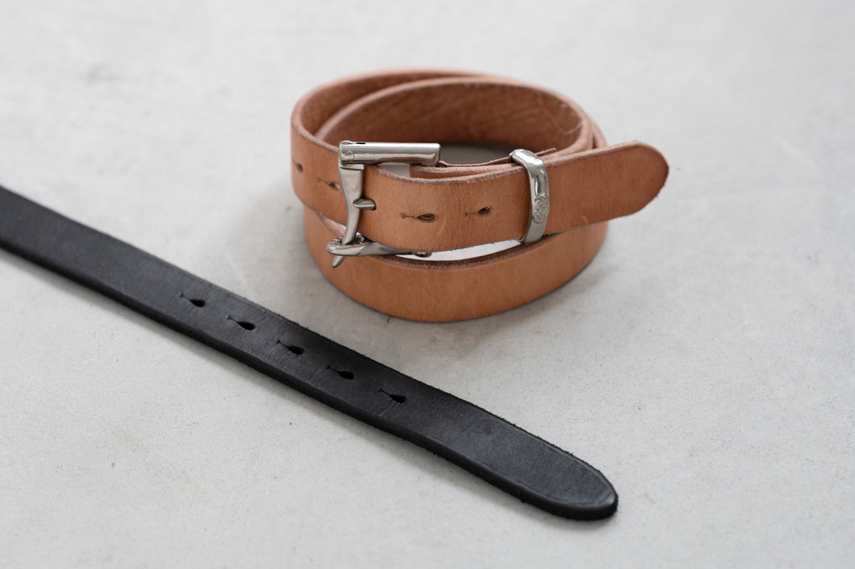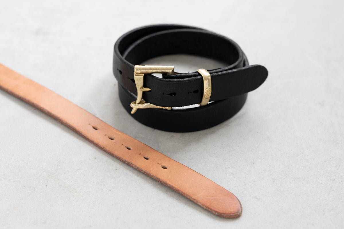 ヌメ、ブラック共に帯部分を仕立て、ピン穴を開けてから、