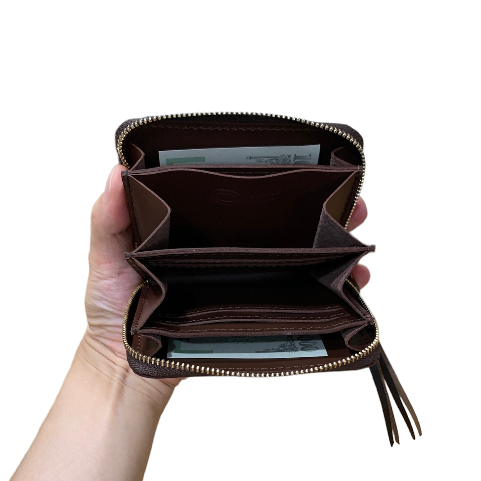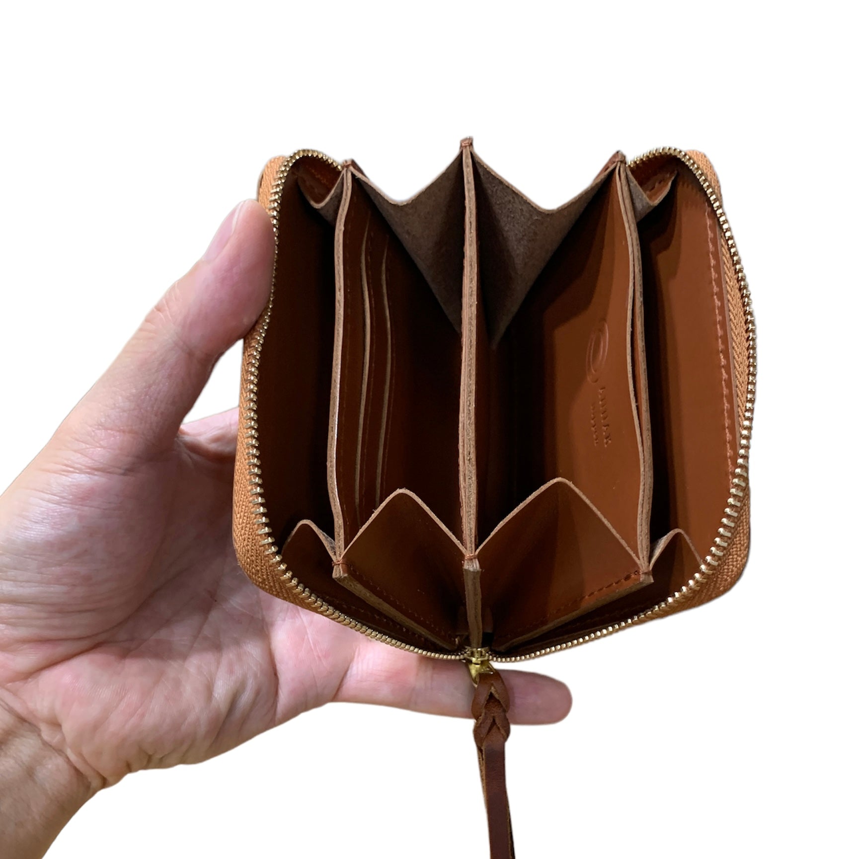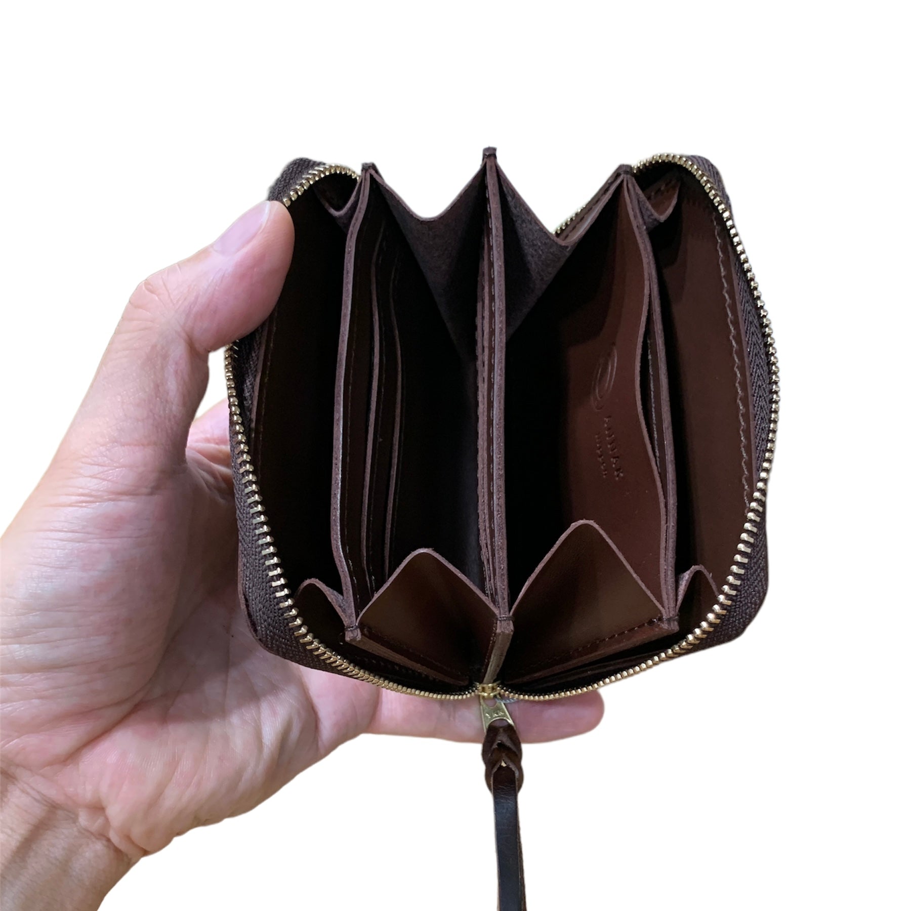 一款圓形拉鍊緊湊型皮夾,所有零件均採用美國油牛皮。