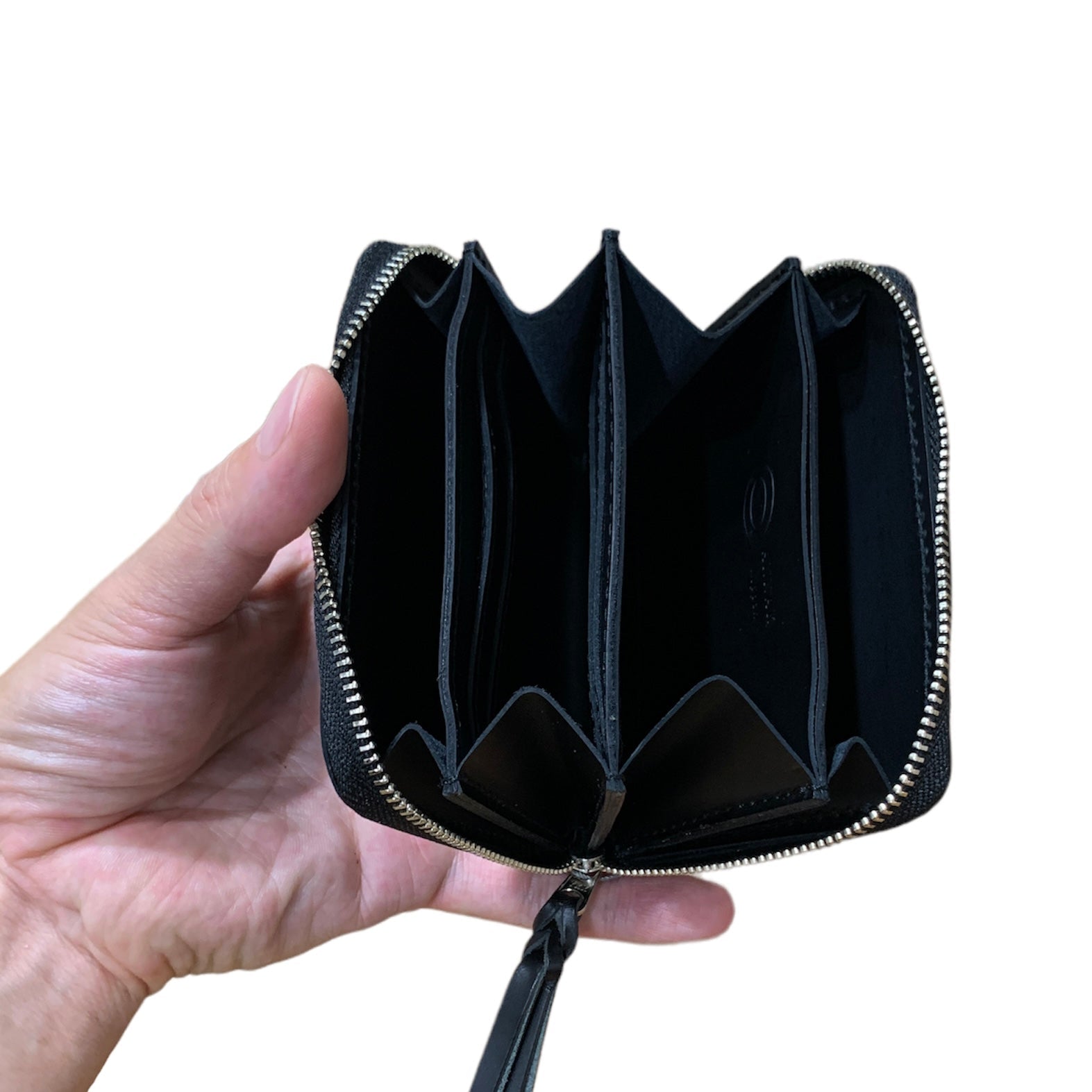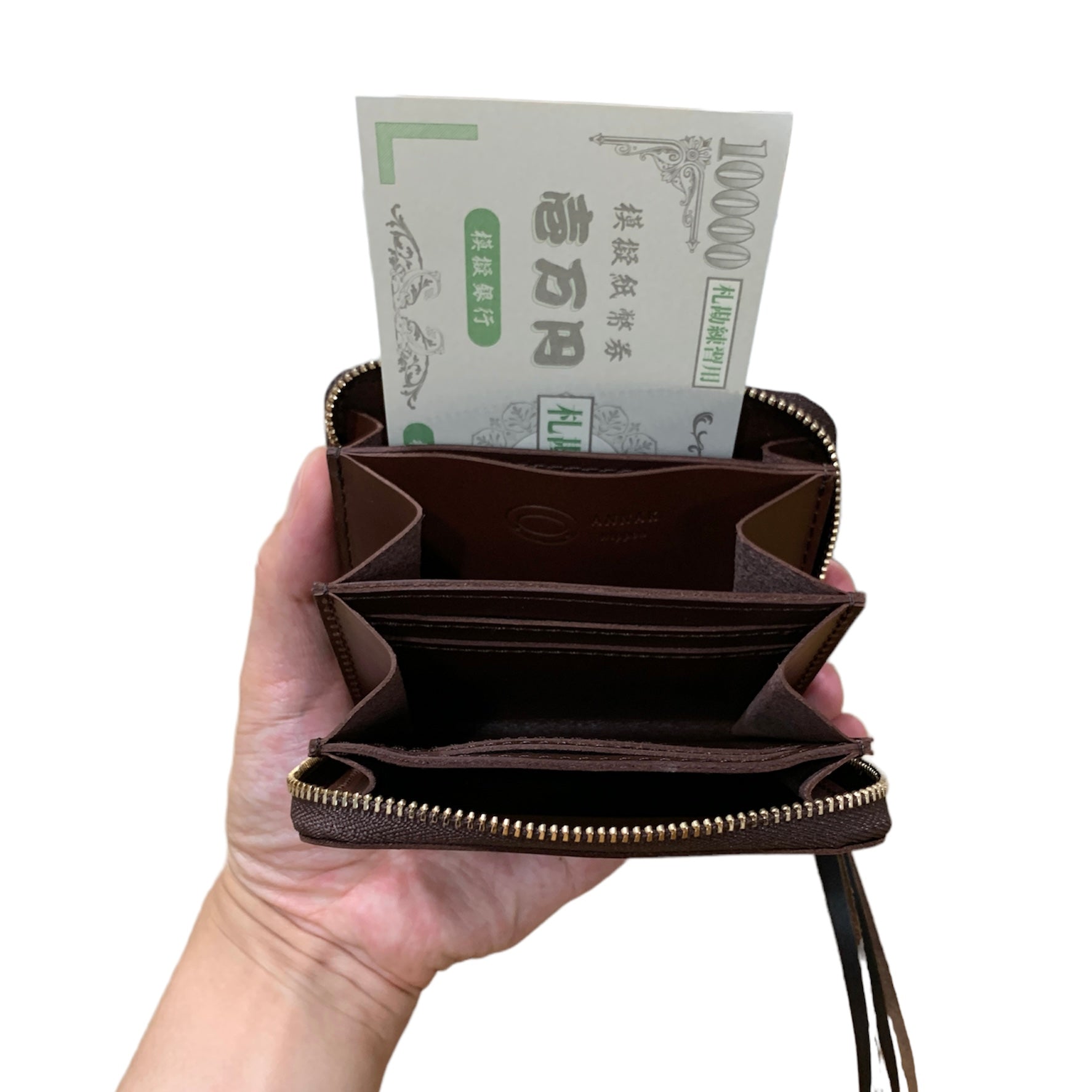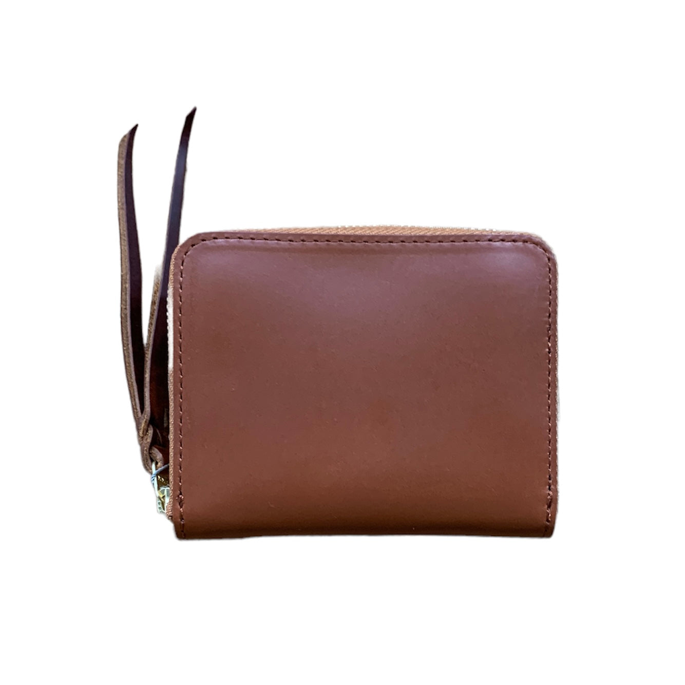 一款圓形拉鍊緊湊型皮夾,所有零件均採用美國油牛皮。