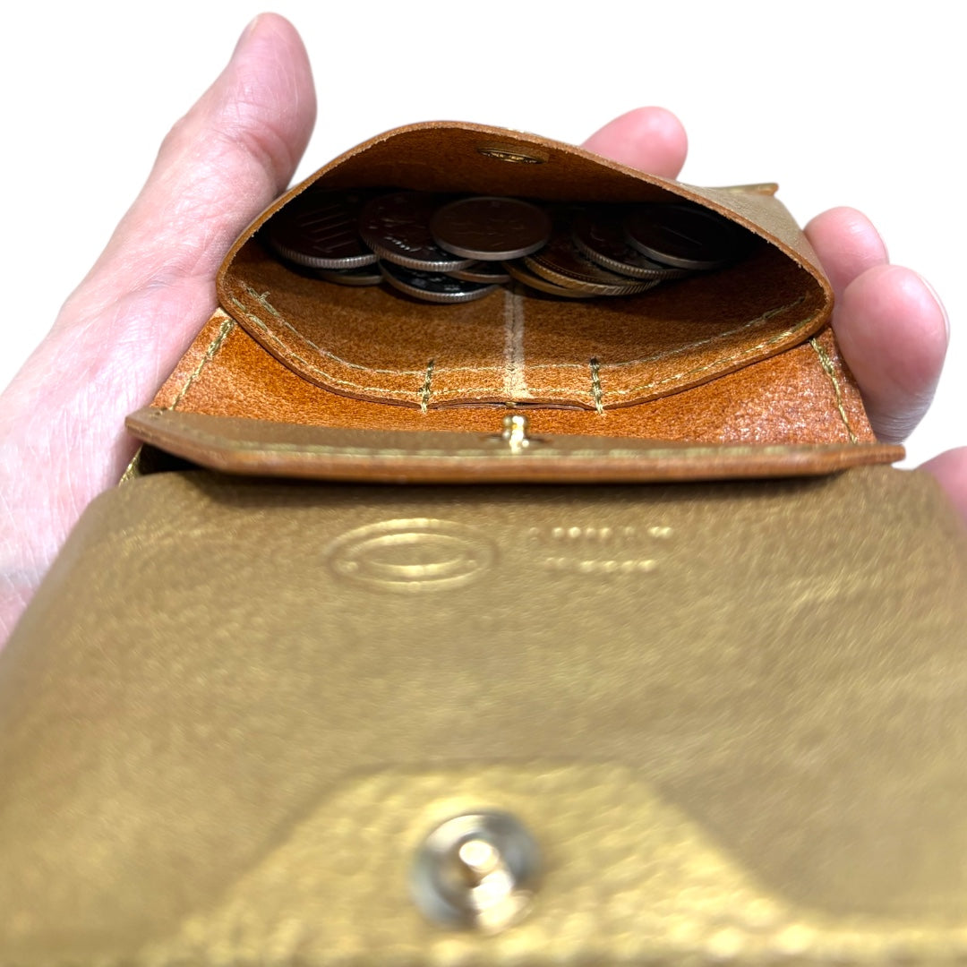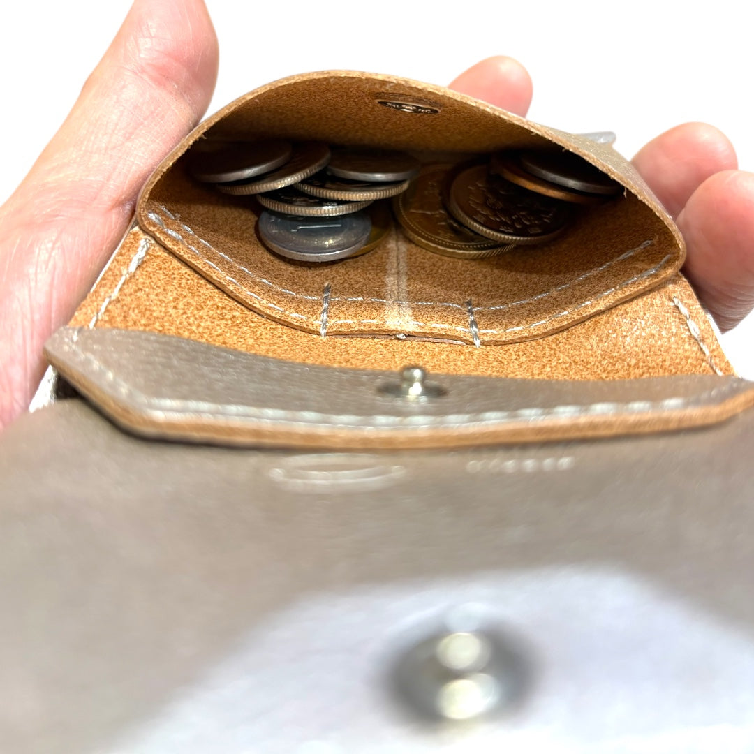 單動式圓形拉鍊緊湊型皮夾,由 Amanda 油皮革和國內鞣製皮革製成。