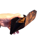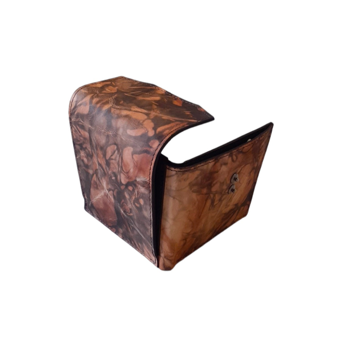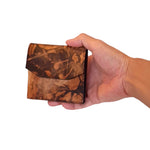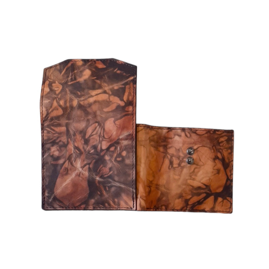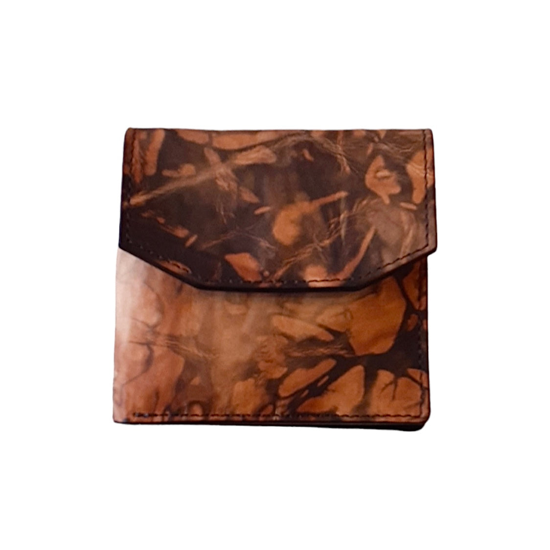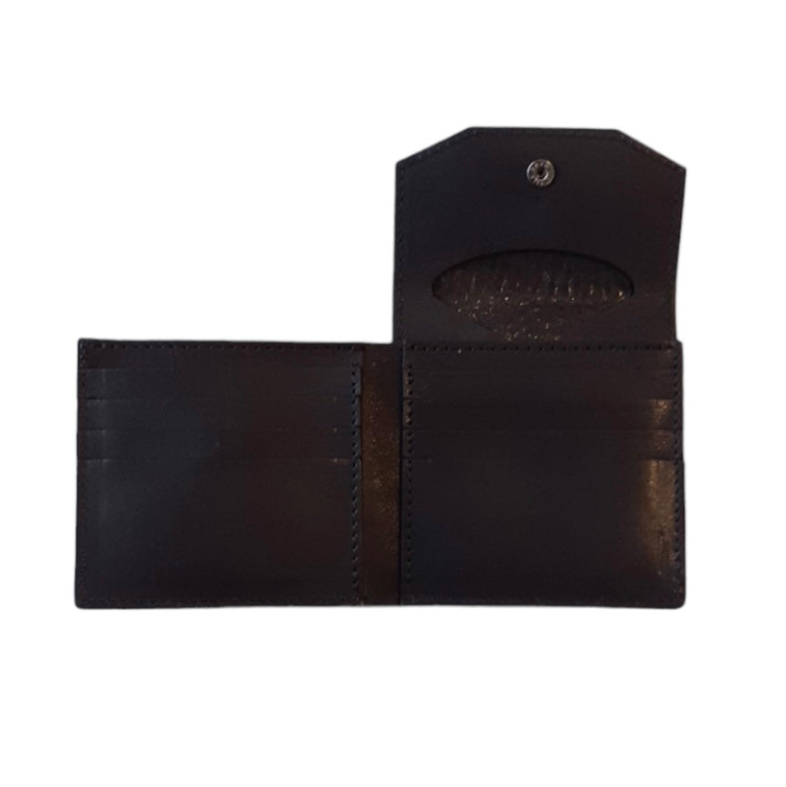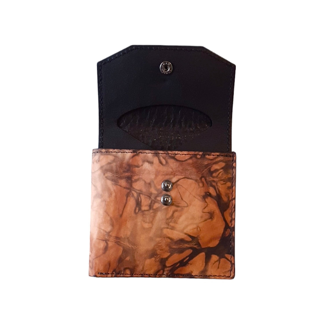 一款單動式小巧雙折皮夾,所有零件均採用阿曼達油皮革和國產鞣革。